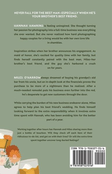 Never fall for the best man-especially when he's your brother's best friend. Hannah Hawkins is feeling uninspired. She thought turning her passion for photography into a full-time business was everything she ever wanted. But she never realized how hard photographing happy couples for a living would be with her own love life in shambles. Inspiration strikes when her brother announces his engagement. As maid of honor, she's excited for quality time with her family, but finds herself constantly paired with the best man, Miles-her brother's best friend, and the guy she's harbored a crush on for years. Miles O'Harrow always dreamed of buying his grandpa's old bar from his uncle, but an in-depth look at the financials proves the purchase to be more of a nightmare than he realized. After a much-needed remodel puts his business even further into the red, he's desperate to get new customers through the door. While carrying the burden of his new business endeavor alone, Miles agrees to help plan his best friend's wedding. He finds himself looking forward to the extra responsibility when it involves extra time spent with Hannah, who has been avoiding him for the better part of a year. Working together after hours has Hannah and Miles sharing more than just a bottle of bourbon. Will they check off each item of their ridiculous to-do list, and get on with their lives? Or will the extra time spent together uncover long-buried feelings?