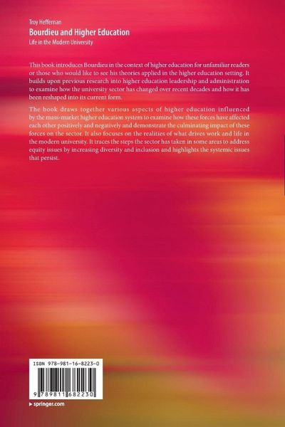This book introduces Bourdieu in the context of higher education for unfamiliar readers or those who would like to see his theories applied in the higher education setting. It builds upon research into higher education leadership and administration to examine how the university sector has changed over recent decades and how it has been reshaped into its current form.The book draws together various aspects of higher education influenced by the mass-market higher education system to examine how these forces have affected each other positively and negatively and demonstrate the culminating impact of these forces on the sector. It also focuses on the realities of what drives work and life in the modern university. It traces the steps the sector has taken in some areas to address equity issues by increasing diversity and inclusion and highlights the systemic issues that persist.