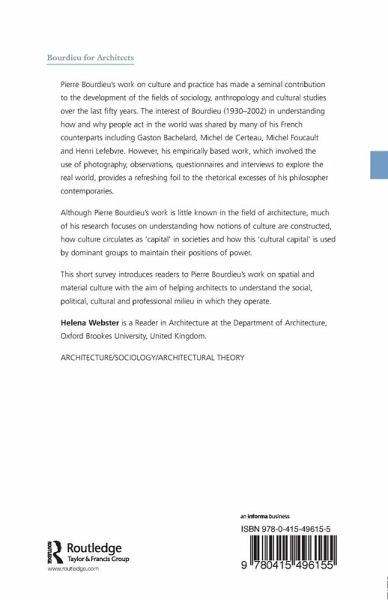 Pierre Bourdieu is arguably one of the twentieth century's greatest socio-philosophical thinkers and his writings have much to offer anyone interested in the ways that people value, consume and produce architecture. Bourdieu spent much of his life attempting to understand cultural consumption and production through detailed empirical research that included studies of dwellings, art, museums, photography and aesthetics. This book introduces the architectural reader to Bourdieu's key writings on culture and outlines the ways in which they offer powerful practical tools and novel conceptual frameworks for understanding architectural value, taste, and practice.