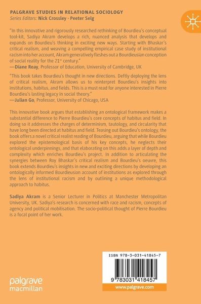 This innovative book argues that establishing an ontological framework makes a substantial difference to Pierre Bourdieu s core concepts of habitus and field. In doing so it addresses the charges of determinism, tautology, and circularity that have long been directed at habitus and field. Teasing out Bourdieu s ontology, the book offers a novel critical realist reading of Bourdieu, arguing that while Bourdieu explored the epistemological basis of his key concepts, he neglects their ontological underpinnings, and that elaborating on this adds a layer of depth and complexity which enriches Bourdieu s project. In addition to articulating the synergies between Roy Bhaskar s critical realism and Bourdieu s oeuvre, this book extends Bourdieu s insights in new and exciting directions by developing an ontologically informed Bourdieusian account of institutions as explored through the lens of institutional racism and by outlining a unique methodological approach to habitus.