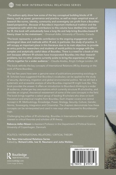 This book rethinks the key concepts of International Relations by drawing on the work of Pierre Bourdieu. The last few years have seen a genuine wave of publications promoting sociology in international relations. Scholars have suggested that Bourdieu's vocabulary can be applied to study security, diplomacy, migration and global environmental politics. Yet we still lack a systematic and accessible analysis of what Bourdieu-inspired IR might look like. This book provides the answer. It offers an introduction to Bourdieu's thinking to a wider IR audience, challenges key assumptions, which currently structure IR scholarship - and provides an original, theoretical restatement of some of the core concepts in the field. The book brings together a select group of leading IR scholars who draw on both theoretical and empirical insights from Bourdieu. Each chapter covers one central concept in IR: Methodology, Knowledge, Power, Strategy, Security, Culture, Gender, Norms, Sovereignty and Integration. The chapters demonstrate how these concepts can be reinterpreted and used in new ways when exposed to Bourdieusian logic. Challenging key pillars of IR scholarship, Bourdieu in International Relations will be of interest to critical theorists, and scholars of IR theory.