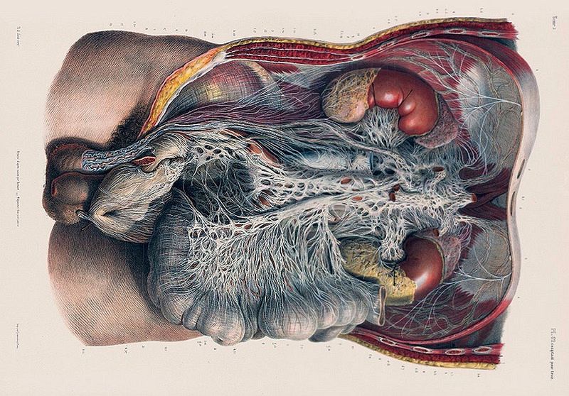 Jean Marc Bourgery (1797 - 1849), Chirurg und Anatom, studierte Medizin in Paris bei Laennec und Duyputren, gewann verschiedene Goldmedaillen für seine herausragenden Leistungen an der Pariser Fakultät für Medizin und publizierte in einem Zeitraum von zwanzig Jahren einen achtbändigen Anatomie-Atlas in folio (430 x 320 mm), der zu den umfassendsten und prächtigsten Werken der Medizingeschichte gehört. Auf insgesamt 726 handkolorierten Lithografien, die von Nicolas Henri Jacob (1782 - 1871), einem Schüler Jacques Louis David, ausgeführt wurden, sind die meisten Präparate lebensgroß abgebildet. Die präzise wie auch ästhetische Darstellung verweist geradezu auf die vorausgegangenen Laboruntersuchungen, die Grundlage jeder einzelnen zeichnerischen Umsetzung bilden. Durch die aufwändige Kolorierung werden die Tafeln schließlich zum erlesensten Anschauungsmaterial, wie ein Vergleich mit unkolorierten Ausgaben sehr deutlich werden läßt.