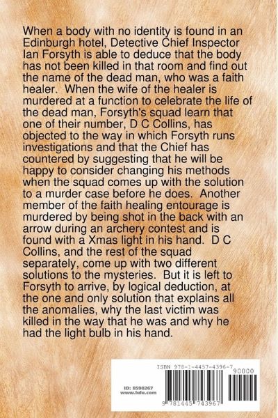 When a body with no identity is found in an Edinburgh hotel, Detective Chief Inspector Ian Forsyth is able to deduce that the body has not been killed in that room and find out the name of the dead man, who was a faith healer. The wife of the healer is then murdered at a function to celebrate the life of the dead man. Finally, another member of the faith healing entourage is murdered by being shot in the back with an arrow during an archery contest and is found with a Xmas light in his hand. D C Collins, and the rest of the murder squad separately, come up with two different solutions. But it is left to Forsyth to arrive, by logical deduction, at the one and only solution that explains all the anomalies, why the last victim was killed in the way that he was and why he had the light bulb in his hand.