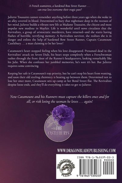 A French seamstress, a hardened Bow Street Runner . . . can true love overcome their tragic past? Juliette Toussaint cannot remember anything before three years ago when she woke in an alley covered in blood. Determined to bury that nightmare deep in the recesses of her mind, Juliette builds a vibrant new life as Madame Toussaint, the chicest and most popular new modiste in Mayfair. Life is wonderful until news circulates that the Revivalists, a group of aristocratic murderers, have returned--and she starts having flashes of horrible, terrifying memory. A Revivalists survivor, she realizes she is in danger and enlists the help of hardened Bow Street Runner, Captain Catamount Castlebury . . . a man claiming to be her lover! Catamount's heart stopped feeling when his love disappeared. Presumed dead in the Revivalists' attack on Seven Dials, his heart stops completely when a Frenchwoman rushes through the front door of the Runner's headquarters, looking remarkably like his Julie. When she confesses her jumbled memories, he's sure it's her. But Juliette requires some convincing. Keeping her safe is Catamount's top priority, but he can't stop his heart from wanting, and soon their old sizzling chemistry is heating up between them. Determined not to lose her once more, Catamount sets up camp at her Bond Street flat. The Revivalists despise loose ends, and they'll do everything it takes to get to Juliette. Now Catamount and his Runners must capture the killers once and for all, or risk losing the woman he loves . . . again! Note: This series is part of Dragonblade's Flame line, so this is a scorching-hot read with open-door steam. The Castleburys Mayfair Misfit Duke Undone Dockside Duchess London's Leading Lady Bow Street Baron