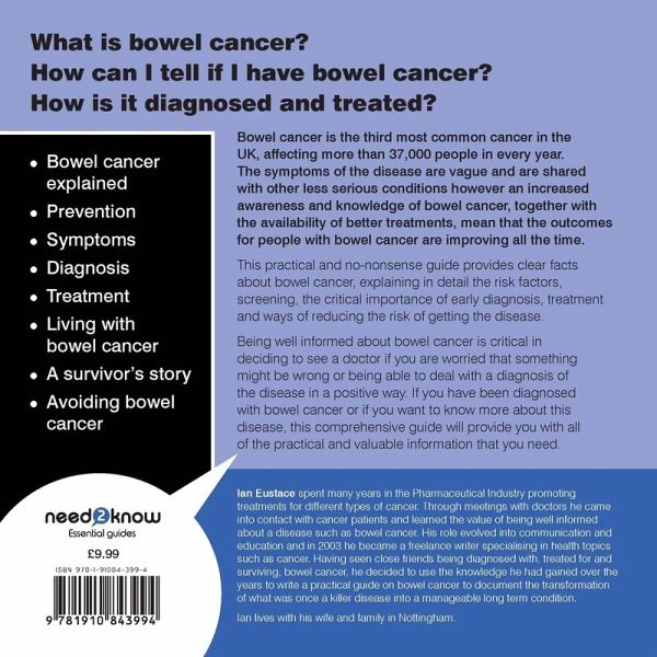 Bowel cancer is the third most common cancer in the UK, affecting more than 37,000 people. However, with early diagnosis the condition can be managed effectively to allow patients to lead as normal a life as possible for as long as possible. This book will inform and help those who have been diagnosed with bowel cancer, their family and friends, and those who simply want to know more about the condition. The book will contain practical advice and information on treatment choices and how to cope on a daily basis. For healthy individuals it also gives valuable information about how you can reduce the risk of developing bowel cancer and useful tips on healthy eating and lifestyles. Written by a freelance medical author, this book aims to provide a reassuring and sensitive resource of information for use during a time when a person with a cancer diagnosis has so much to think about. People often say their time with their cancer specialists is limited and full of complicated terminology; this book aims to supplement this information, written in an easy-to-understand way.