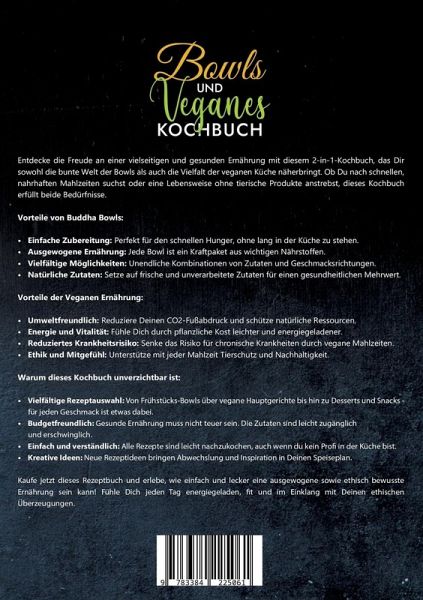 Entdecke die Freude an einer vielseitigen und gesunden Ernährung mit diesem 2-in-1-Kochbuch, das Dir sowohl die bunte Welt der Bowls als auch die Vielfalt der veganen Küche näherbringt. Ob Du nach schnellen, nahrhaften Mahlzeiten suchst oder eine Lebensweise ohne tierische Produkte anstrebst, dieses Kochbuch erfüllt beide Bedürfnisse.Vorteile von Buddha Bowls:- Einfache Zubereitung: Perfekt für den schnellen Hunger, ohne lang in der Küche zu stehen.- Ausgewogene Ernährung: Jede Bowl ist ein Kraftpaket aus wichtigen Nährstoffen.- Vielfältige Möglichkeiten: Unendliche Kombinationen von Zutaten und Geschmacksrichtungen.- Natürliche Zutaten: Setze auf frische und unverarbeitete Zutaten für einen gesundheitlichen Mehrwert.Vorteile der Veganen Ernährung:- Umweltfreundlich: Reduziere Deinen CO2-Fußabdruck und schütze natürliche Ressourcen.- Energie und Vitalität: Fühle Dich durch pflanzliche Kost leichter und energiegeladener.- Reduziertes Krankheitsrisiko: Senke das Risiko für chronische Krankheiten durch vegane Mahlzeiten.- Ethik und Mitgefühl: Unterstütze mit jeder Mahlzeit Tierschutz und Nachhaltigkeit.Warum dieses Kochbuch unverzichtbar ist:- Vielfältige Rezeptauswahl: Von Frühstücks-Bowls über vegane Hauptgerichte bis hin zu Desserts und Snacks - für jeden Geschmack ist etwas dabei.- Budgetfreundlich: Gesunde Ernährung muss nicht teuer sein. Die Zutaten sind leicht zugänglich und erschwinglich.- Einfach und verständlich: Alle Rezepte sind leicht nachzukochen, auch wenn du kein Profi in der Küche bist.- Kreative Ideen: Neue Rezeptideen bringen Abwechslung und Inspiration in Deinen Speiseplan.Kaufe jetzt dieses Rezeptbuch und erlebe, wie einfach und lecker eine ausgewogene sowie ethisch bewusste Ernährung sein kann! Fühle Dich jeden Tag energiegeladen, fit und im Einklang mit Deinen ethischen Überzeugungen.