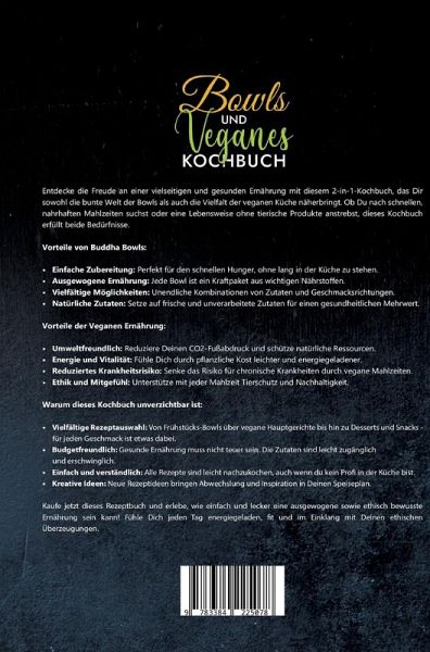 Entdecke die Freude an einer vielseitigen und gesunden Ernährung mit diesem 2-in-1-Kochbuch, das Dir sowohl die bunte Welt der Bowls als auch die Vielfalt der veganen Küche näherbringt. Ob Du nach schnellen, nahrhaften Mahlzeiten suchst oder eine Lebensweise ohne tierische Produkte anstrebst, dieses Kochbuch erfüllt beide Bedürfnisse.Vorteile von Buddha Bowls:- Einfache Zubereitung: Perfekt für den schnellen Hunger, ohne lang in der Küche zu stehen.- Ausgewogene Ernährung: Jede Bowl ist ein Kraftpaket aus wichtigen Nährstoffen.- Vielfältige Möglichkeiten: Unendliche Kombinationen von Zutaten und Geschmacksrichtungen.- Natürliche Zutaten: Setze auf frische und unverarbeitete Zutaten für einen gesundheitlichen Mehrwert.Vorteile der Veganen Ernährung:- Umweltfreundlich: Reduziere Deinen CO2-Fußabdruck und schütze natürliche Ressourcen.- Energie und Vitalität: Fühle Dich durch pflanzliche Kost leichter und energiegeladener.- Reduziertes Krankheitsrisiko: Senke das Risiko für chronische Krankheiten durch vegane Mahlzeiten.- Ethik und Mitgefühl: Unterstütze mit jeder Mahlzeit Tierschutz und Nachhaltigkeit.Warum dieses Kochbuch unverzichtbar ist:- Vielfältige Rezeptauswahl: Von Frühstücks-Bowls über vegane Hauptgerichte bis hin zu Desserts und Snacks - für jeden Geschmack ist etwas dabei.- Budgetfreundlich: Gesunde Ernährung muss nicht teuer sein. Die Zutaten sind leicht zugänglich und erschwinglich.- Einfach und verständlich: Alle Rezepte sind leicht nachzukochen, auch wenn du kein Profi in der Küche bist.- Kreative Ideen: Neue Rezeptideen bringen Abwechslung und Inspiration in Deinen Speiseplan.Kaufe jetzt dieses Rezeptbuch und erlebe, wie einfach und lecker eine ausgewogene sowie ethisch bewusste Ernährung sein kann! Fühle Dich jeden Tag energiegeladen, fit und im Einklang mit Deinen ethischen Überzeugungen.