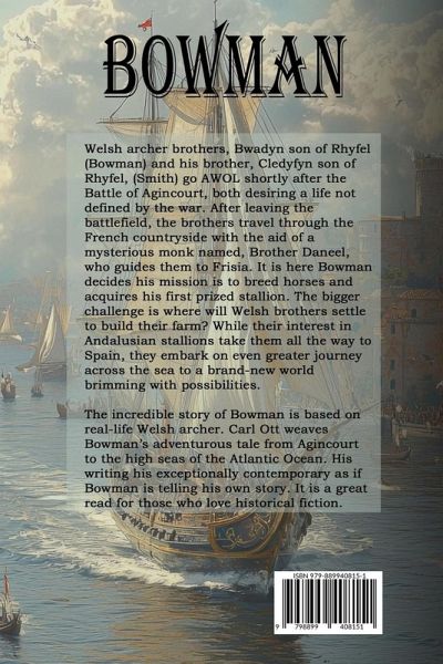 Welsh archer brothers, Bwadyn son of Rhyfel (Bowman) and his brother, Cledyfyn son of Rhyfel, (Smith) are devastated by the brutality of the Battle of Agincourt, and more so by the loss of their good friends. Afterward, the brothers go AWOL, both desiring a life not defined by the war. After leaving the battlefield, the brothers travel through the French countryside with the aid of a mysterious monk named, Brother Daneel, who guides them to Frisia. It is here Bowman decides his mission is to breed horses and acquires his first prized stallion. The bigger challenge is where will Welsh brothers settle to build their farm? While their interest in Andalusian stallions take them all the way to Spain, they embark on even greater journey across the sea to a brand-new world brimming with possibilities. The incredible story of Bowman is inspired by the legend of Madoc, a Welsh prince who sailed across the Atlantic and discovered a new world. Carl Ott weaves Bowman's adventurous tale from Agincourt to the high seas of the Atlantic Ocean. His writing his exceptionally contemporary as if Bowman is telling his own story. It is a great read for those who love historical fiction.