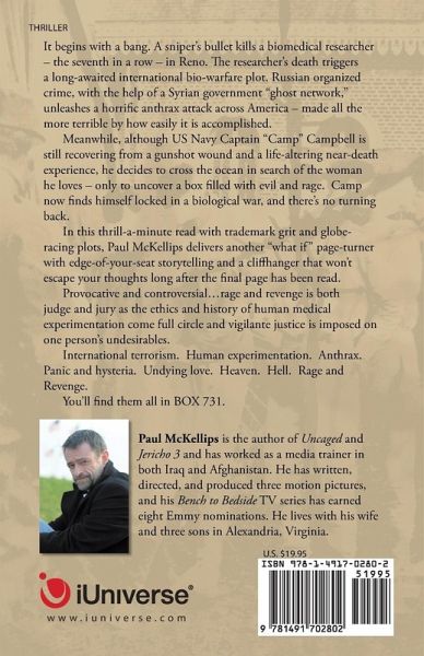 It begins with a bang. A sniper's bullet kills a biomedical researcher - the seventh in a row - in Reno. The researcher's death triggers a long-awaited international bio-warfare plot. Russian organized crime, with the help of a Syrian government "ghost network," unleashes a horrific anthrax attack across America - made all the more terrible by how easily it is accomplished. Meanwhile, although US Navy Captain "Camp" Campbell is still recovering from a gunshot wound and a life-altering near-death experience, he decides to cross the ocean in search of the woman he loves - only to uncover a box filled with evil and rage. Camp now finds himself locked in a biological war, and there's no turning back. In this thrill-a-minute read with trademark grit and globe-racing plots, Paul McKellips delivers another "what if" page-turner with edge-of-your-seat storytelling and a cliffhanger that won't escape your thoughts long after the final page has been read. Provocative and controversial...rage and revenge is both judge and jury as the ethics and history of human medical experimentation come full circle and vigilante justice is imposed on one person's undesirables. International terrorism. Human experimentation. Anthrax. Panic and hysteria. Undying love. Heaven. Hell. Rage and Revenge. You'll find them all in BOX 731.