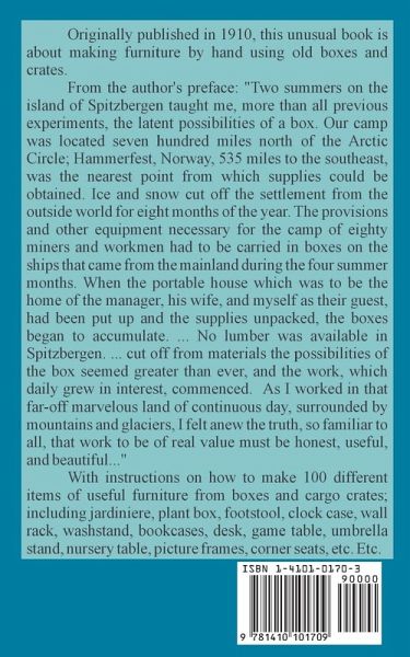Originally published in 1910, this unusual book is about making furniture by hand using old boxes and crates. From the author's preface: "Two summers on the island of Spitzbergen taught me, more than all previous experiments, the latent possibilities of a box. Our camp was located seven hundred miles north of the Arctic Circle; Hammerfest, Norway, 535 miles to the southeast, was the nearest point from which supplies could be obtained. Ice and snow cut off the settlement from the outside world for eight months of the year. The provisions and other equipment necessary for the camp of eighty miners and workmen had to be carried in boxes on the ships that came from the mainland during the four summer months. When the portable house which was to be the home of the manager, his wife, and myself as their guest, had been put up and the supplies unpacked, the boxes began to accumulate. ... No lumber was available in Spitzbergen. ... cut off from materials the possibilities of the box seemed greater than ever, and the work, which daily grew in interest, commenced. As I worked in that far-off marvelous land of continuous day, surrounded by mountains and glaciers, I felt anew the truth, so familiar to all, that work to be of real value must be honest, useful, and beautiful..." With instructions on how to make 100 different items of useful furniture from boxes and cargo crates; including jardiniere, plant box, footstool, clock case, wall rack, washstand, bookcases, desk, game table, umbrella stand, nursery table, picture frames, corner seats, etc. etc.