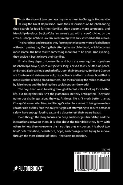 This is the story of two teenage boys who meet in Chicago's Hooverville during the Great Depression. From their discussions on baseball during their search for food for their families, they become more connected, and friendship develops. Benji, a Cubs fan, wears a cap with a large C stitched on the crown. George, a White Sox fan, wears a cap with an S stitched on the crown. The hardships and struggles they face together become more of a challenge with each passing day. During their attempt to search for food, which becomes more scarce, the boys realize something more has to be done. One evening, they decide it best to leave their families. Finally, they depart Hooverville, and both are wearing their signature baseball caps, frayed, worn-out jackets, long-sleeved shirts, scuffed-up pants, and shoes. Each carries a pocketknife. Upon their departure, Benji and George are fourteen and sixteen years old, respectively, and form a closer bond that is more like that of being blood brothers. The thrill of riding the rails is motivated by false hopes and the feeling they could conquer the world. The boys head west, traveling through different states, looking for a better life, but riding the rails isn't the glamorous life they anticipated. They face numerous challenges along the way. At times, life isn't much better than at Chicago's Hooverville. Benji and George's adventure is one of being on a roller-coaster ride as they face the daily struggles of attempting to secure personal safety, have enough food to eat, and a place to rest their weary heads. Even though the story focuses on Benji and George's friendship and the interactions between them, it is also about the friendships they form with others to help them overcome the hardships they encounter. It is about two boys' determination, persistence, hope, and courage while trying to survive through the most difficult of times--the Great Depression.