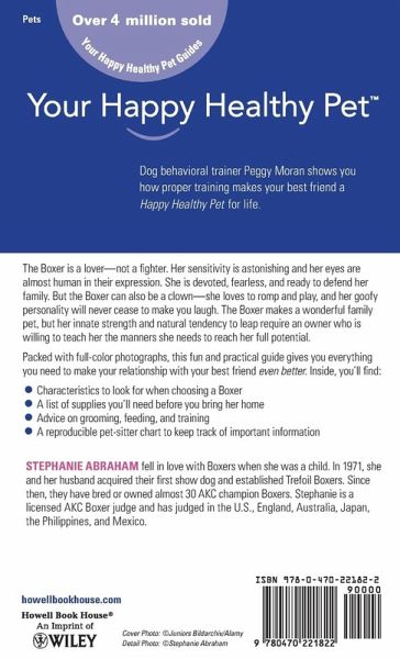 Your Happy Healthy Pet 30-minute large-breed training DVD contains bonus material specifically for your Boxer! Dog behavioral trainer Peggy Moran shows you how proper training makes your best friend a "Happy Healthy Pet" for life. The Boxer is a lover--not a fighter. Her sensitivity is astonishing and her eyes are almost human in their expression. She is devoted, fearless, and ready to defend her family. But the Boxer can also be a clown--she loves to romp and play, and her goofy personality will never cease to make you laugh. The Boxer makes a wonderful family pet, but her innate strength and natural tendency to leap require an owner who is willing to teach her the manners she needs to reach her full potential. Packed with full-color photographs, this fun and practical guide gives you everything you need to make your relationship with your best friend even better. Inside, you'll find: Characteristics to look for when choosing a Boxer A list of supplies you'll need before you bring her home Advice on grooming, feeding, and training A reproducible pet-sitter chart to keep track of important information A bonus DVD shows you that educating your Boxer positively is easier and more fun than you think. You'll learn how to teach your furry friend basic commands and tricks, correct inappropriate behaviors, and understand her unique personality.