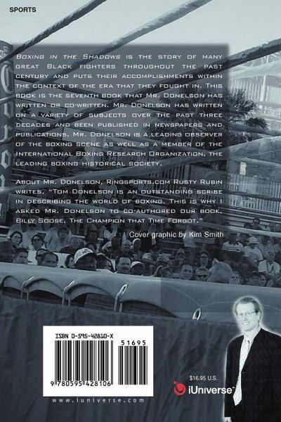 Boxing In The Shadows is the story of many great Black fighters throughout the past century and puts their accomplishments within the context of the era that they fought in. This book is the seventh book that Mr. Donelson has written or co-written. Mr. Donelson has written on a variety of subjects over the past three decades and been published in newspapers and publications, Mr. Donelson is a leading observer of the boxing scene as well as a member of the International Boxing Research Organization, the leading boxing historical society. About Mr. Donelson, Ringsports.com Rusty Rubin writes, "Tom Donelson is an outstanding scribe in describing the world of boxing. This is why I asked Mr. Donelson to co-authored our book, Billy Soose, The Champion that Time Forgot."