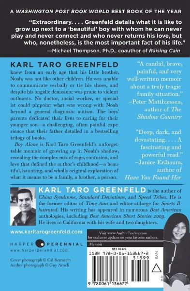"Boy Alone unlocks the heart and lets the emotions pour out: grief, despair, anger, love, devotion and wonder. Whether you are a parent or a sibling of someone with autism or just looking in from the outside through this rarely opened window into the complex life of a family coping with autism, you will never forget this book." --Portia Iversen, Co-Founder of Cure Autism Now Foundation and author of Strange Son A Washington Post Book World Best Book of the Year In this literary tour de force, Karl Taro Greenfield, acclaimed journalist and author of China Syndrome, tells the story of his life growing up with his brother, chronicling the hopes, dreams, and realities of life with an autistic sibling. Karl Taro Greenfeld knew from an early age that his little brother, Noah, was not like other children. He was unable to communicate verbally or tie his shoes, and despite his angelic demeanor was prone to violent outbursts. No doctor, social worker, or specialist could pinpoint what was wrong with Noah beyond a general diagnosis: autism. The boys' parents dedicated their lives to caring for their younger son--a challenging, often painful experience that their father detailed in a bestselling trilogy of books. Boy Alone is Karl Taro Greenfeld's unforgettable memoir of growing up in Noah's shadow, revealing the complex mix of rage, confusion, and love that defined the author's childhood--a beautiful, haunting, and wholly original exploration of what it means to be a family, a brother, a person.