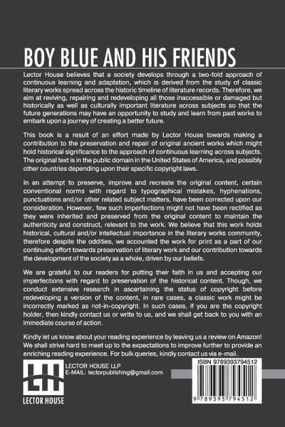 NEW PRINT WITH PROFESSIONAL TYPE-SET IN CONTRAST TO SCANNED PRINTS OFFERED BY OTHERS Boy Blue And His Friends This book is a result of an effort made by us towards making a contribution to the preservation and repair of original classic literature. In an attempt to preserve, improve and recreate the original content, we have worked towards: 1. Type-setting & Reformatting: The complete work has been re-designed via professional layout, formatting and type-setting tools to re-create the same edition with rich typography, graphics, high quality images, and table elements, giving our readers the feel of holding a 'fresh and newly' reprinted and/or revised edition, as opposed to other scanned & printed (Optical Character Recognition - OCR) reproductions. 2. Correction of imperfections: As the work was re-created from the scratch, therefore, it was vetted to rectify certain conventional norms with regard to typographical mistakes, hyphenations, punctuations, blurred images, missing content/pages, and/or other related subject matters, upon our consideration. Every attempt was made to rectify the imperfections related to omitted constructs in the original edition via other references. However, a few of such imperfections which could not be rectified due to intentional\unintentional omission of content in the original edition, were inherited and preserved from the original work to maintain the authenticity and construct, relevant to the work. We believe that this work holds historical, cultural and/or intellectual importance in the literary works community, therefore despite the oddities, we accounted the work for print as a part of our continuing effort towards preservation of literary work and our contribution towards the development of the society as a whole, driven by our beliefs. We are grateful to our readers for putting their faith in us and accepting our imperfections with regard to preservation of the historical content. HAPPY READING!