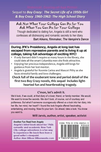 During JFK's Presidency, Angela at long last has escaped from repressive parents and is living it up at college, taking full advantage of exciting NYC! ¿If only Barnard didn't require so many hours in the library, she could date all the smart Columbia men she finds attractive. ¿Enjoying her precious independence, Angela still longs for guidance from her lost mentor. ¿Angela is grateful for Roomie Carina and Mascot Pithy as she faces stressful family and love challenges. Chock full of the exuberant tone and period detail of the first two Boy Crazy novels, this sequel includes light-hearted fun and heartbreaking tragedy.