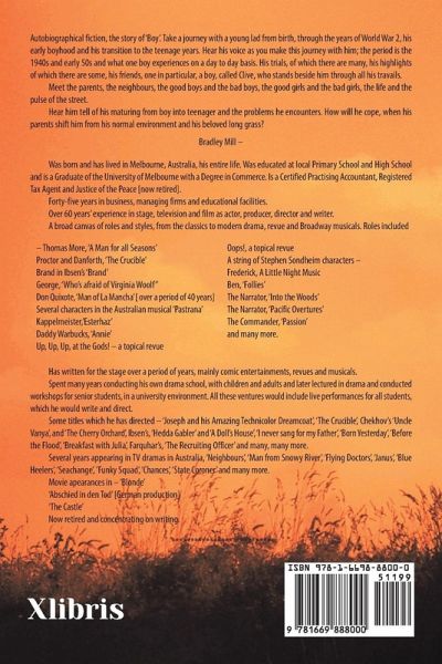 Autobiographical fiction, the story of 'Boy'. Take a journey with a young lad from birth, through the years of World War 2, his early boyhood and his transition to the teenage years. Hear his voice as you make this journey with him; the period is the 1940s and early 50s and what one boy experiences on a day to day basis. His trials, of which there are many, his highlights of which there are some, his friends, one in particular, a boy, called Clive, who stands beside him through all his travails. Meet the parents, the neighbours, the good boys and the bad boys, the good girls and the bad girls, the life and the pulse of the street. Hear him tell of his maturing from boy into teenager and the problems he encounters. How will he cope, when his parents shift him from his normal environment and his beloved long grass?