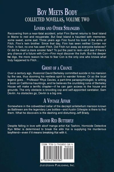 Lovers and Other Strangers Recovering from a near-fatal accident, artist Finn Barret returns to Seal Island in Maine to rest and recuperate.Three years ago Finn found his lover in the arms of his twin brother. Since that day, Finn has seen neither Conlan nor Fitch. In fact, no one has seen Fitch. Did Fitch run away as everyone believes? Ghost of a Chance Over a century ago, Illusionist David Berkeley committed suicide in his mansion by the sea, thus dooming his restless spirit to wander forever. Professor Rhys Davies, a part-time parapsychologist, is writing a book on Berkeley House--the only obstacle is brooding cop and self-appointed caretaker, Sam Devlin. A Vintage Affair Somewhere in the cobwebbed cellar of the decrepit antebellum mansion known as Ballineen are the legendary Lee bottles—and Austin Gillespie is there to find them. What he discovers is the dashing and disturbing Jeff Brady. Blood Red Butterfly Despite falling in love with aloof manga artist Kai Tashiro, Homicide Detective Ryo Miller is determined to break the alibi Kai is supplying his murderous boyfriend—even if it means breaking Kai with it.
