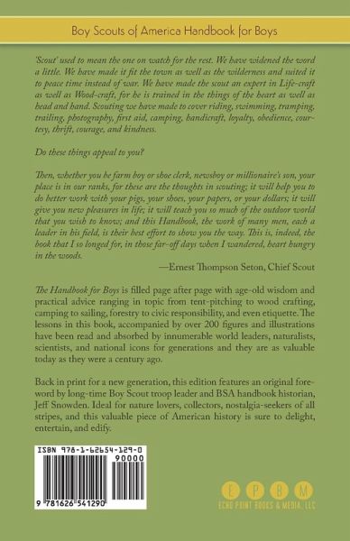 "'Scout' used to mean the one on watch for the rest. We have widened the word a little. We have made it fit the town as well as the wilderness and suited it to peace time instead of war. We have made the scout an expert in Life-craft as well as Wood-craft, for he is trained in the things of the heart as well as head and hand. Scouting we have made to cover riding, swimming, tramping, trailing, photography, first aid, camping, handicraft, loyalty, obedience, courtesy, thrift, courage, and kindness. Do these things appeal to you? Then, whether you be farm boy or shoe clerk, newsboy or millionaire's son, your place is in our ranks, for these are the thoughts in scouting; it will help you to do better work with your pigs, your shoes, your papers, or your dollars; it will give you new pleasures in life; it will teach you so much of the outdoor world that you wish to know; and this Handbook, the work of many men, each a leader in his field, is their best effort to show you the way. This is, indeed, the book that I so longed for, in those far-off days when I wandered, heart hungry in the woods." -Ernest Thompson Seton, Chief Scout The Handbook for Boys is filled page after page with age-old wisdom and practical advice ranging in topic from tent-pitching to wood crafting, camping to sailing, forestry to civic responsibility, and even etiquette. The lessons in this book, accompanied by over 200 figures and illustrations have been read and absorbed by innumerable world leaders, naturalists, scientists, and national icons for generations and they are as valuable today as they were a century ago. Back in print for a new generation, this edition features an original foreword by long-time Boy Scout troop leader and BSA handbook historian, Jeff Snowden. Ideal for nature lovers, collectors, nostalgia-seekers of all stripes, and this valuable piece of American history is sure to delight, entertain, and edify.