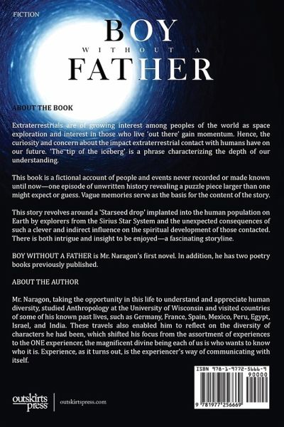While written as fiction, BOY WITHOUT A FATHER is a remembered account of an actual event that occurred in the 13th Century in a remote mountain village on the Eastern slope of the Andes in South America when extraterrestrials from a planet in the Sirius Star System made contact. The journeyers from Sirius are on a mission to facilitate the evolution of those they contact. The contact is not at all random but intentional. In this story, they contacted villagers of a remote Andean Mountain village bringing a gift, a human baby, a boy, who was to grow up as one of the Quechua villagers' own, making this contact the entry point into the reincarnation cycle on Earth for the spirit of this boy. As suggested, the child from space is not the first of its kind. The Sirians have participated in countless instances of such "Starseed drops" on what they call the Blue Planet in a manner so clever and indirect as to influence the spiritual development of its inhabitants delicately. There is little doubt that many humans on Earth today had their origin as spirits who have come from other star systems to influence the course of human evolution on this planet and participate in their evolutionary development. "Drops" are a means the Sirians use to comply with the fundamental law in the galaxy, which is non-interference. The mandate deals primarily with interaction between spacefaring civilizations and non-spacefaring, stating the former should not interfere in the latter's development without adequate cause. The "Down to Earth" narrative proceeds through the first life of this boy on Earth as he grows into adulthood, the fantastic things he does and says to help transform the lives of the villagers, which comes to a shocking climax and reiterates that life is without end.