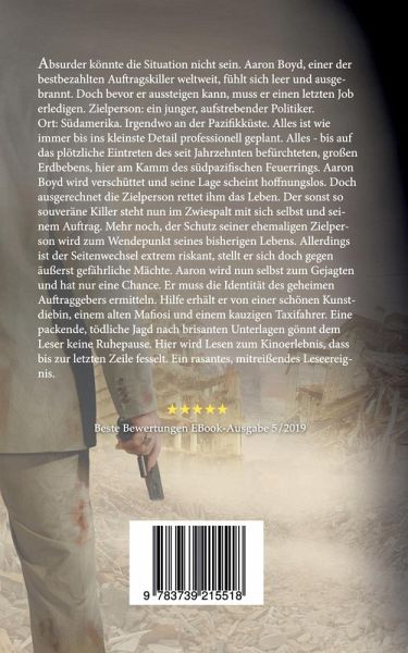 Absurder könnte die Situation nicht sein. Aaron Boyd, einer der bestbezahlten Auftragskiller weltweit, fühlt sich leer und ausgebrannt. Doch bevor er aussteigen kann, muss er einen letzten Job erledigen. Zielperson: ein junger, aufstrebender Politiker. Ort: Südamerika. Irgendwo an der Pazifikküste. Alles ist wie immer bis ins kleinste Detail professionell geplant. Was allerdings nicht vorhersehbar war, ist das plötzliche Eintreten des seit Jahrzehnten befürchteten, großen Erdbebens, hier am Kamm des südpazifischen Feuerrings. Aaron Boyd wird verschüttet und seine Lage scheint hoffnungslos. Doch ausgerechnet die Zielperson rettet ihm das Leben. Der sonst so souveräne Killer steht nun im Zwiespalt mit sich selbst und seinem Auftrag. Mehr noch, der Schutz seiner ehemaligen Zielperson wird zum Wendepunkt seines bisherigen Lebens. Allerdings ist der Seitenwechsel extrem riskant, stellt er sich doch gegen äußerst gefährliche Mächte. Aaron wird nun selbst zum Gejagten und hat nur eine Chance. Er muss die Identität des geheimen Auftraggebers ermitteln. Hilfe erhält er von einer schönen Kunstdiebin, einem alten Mafiosi und einem kauzigen Taxifahrer. Eine packende, tödliche Jagd nach brisanten Unterlagen gönnt dem Leser keine Ruhepause. Hier wird Lesen zum Kinoerlebnis, dass bis zur letzten Zeile fesselt. Ein rasantes, mitreißendes Leseereignis.