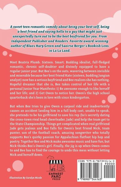 A sweet teen romantic comedy about being your best self, being a best friend and saying hello to a new friend that might just turn out to be the best boyfriend for you. From Independent Publisher and Readers' Favorite award-winning author of Blues Harp Green and Saoirse Berger's Bookish Lens in La La Land. Enjoy book 2 in The Carpool Lane series. Meet Beatrix Plumb. Sixteen. Smart. Budding idealist, full-fledged romantic, chronic self-doubter and divinely equipped to have a regular junior year. But Bee's on the outs, wavering between invisible and miserable because her best friend Kate (sixteen, budding Jungian analyst) now has a serious boyfriend and Bee realizes she has nothing. Hopeful dreamer that she is, Bee takes control of her life with a personal Junior Year Manifesto: 1) Be awesome enough to like herself and her life; and 2) Get Owen to notice her. Owen's the high school quarterback she's been in love with since kindergarten. But when Bee tries to give Owen a carpool ride and inadvertently causes an accident landing him in a full body cast, unable to speak, she pretends to be his girlfriend to save his rep (he's secretly dating the cross-town rival head cheerleader, Jade) and help the team get to the State Championship. Things get complicated when real girlfriend Jade gets jealous and Bee falls for Owen's best friend Nick, team punter, son of the football coach, amazing songwriter who totally supports Bee's quirky passion for Appalachian flatfoot hip hop and poetry. Together Bee and Nick make awesome music and have fun, but Nick thinks Bee's Owen's girl. Finally, the jig is up when Owen comes to and Bee has to find the courage to undo this mess without letting Nick and herself down.