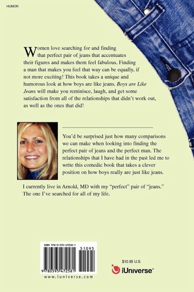 Women love searching for and finding that perfect pair of jeans that accentuates their figures and makes them feel fabulous. Finding a man that makes you feel that way can be equally, if not more exciting! This book takes a unique and humorous look at how boys are like jeans. This book will make you reminisce, laugh, and get some satisfaction from all of the relationships that didn't work out, as well as the ones that did!