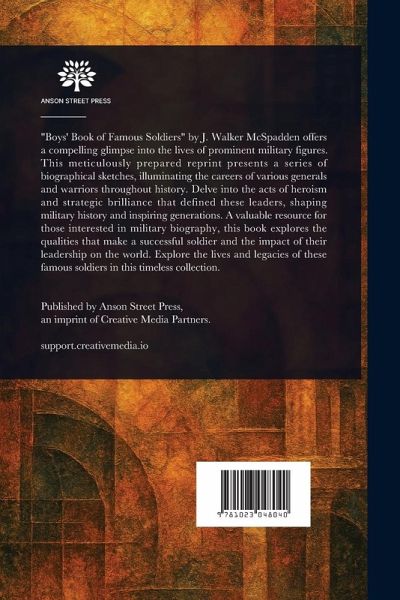 "Boys' Book of Famous Soldiers" by J. Walker McSpadden offers a compelling glimpse into the lives of prominent military figures. This meticulously prepared reprint presents a series of biographical sketches, illuminating the careers of various generals and warriors throughout history. Delve into the acts of heroism and strategic brilliance that defined these leaders, shaping military history and inspiring generations. A valuable resource for those interested in military biography, this book explores the qualities that make a successful soldier and the impact of their leadership on the world. Explore the lives and legacies of these famous soldiers in this timeless collection. This work has been selected by scholars as being culturally important, and is part of the knowledge base of civilization as we know it. This work is in the public domain in the United States of America, and possibly other nations. Within the United States, you may freely copy and distribute this work, as no entity (individual or corporate) has a copyright on the body of the work. Scholars believe, and we concur, that this work is important enough to be preserved, reproduced, and made generally available to the public. We appreciate your support of the preservation process, and thank you for being an important part of keeping this knowledge alive and relevant.