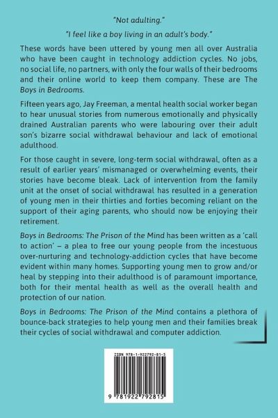 "Not adulting." "I feel like a boy living in an adult's body." These words have been uttered by young men all over Australia who have been caught in technology addiction cycles. No jobs, no social life, no partners, with only the four walls of their bedrooms and their online world to keep them company. These are The Boys in Bedrooms. Fifteen years ago, Jay Freeman, a mental health social worker began to hear unusual stories from numerous emotionally and physically drained Australian parents who were labouring over their adult son's bizarre social withdrawal behaviour and lack of emotional adulthood. For those caught in severe, long-term social withdrawal, often as a result of earlier years' mismanaged or overwhelming events, their stories have become bleak. Lack of intervention from the family unit at the onset of social withdrawal has resulted in a generation of young men in their thirties and forties becoming reliant on the support of their aging parents, who should now be enjoying their retirement. Boys in Bedrooms: The Prison of the Mind has been written as a 'call to action' - a plea to free our young people from the incestuous over-nurturing and technology-addiction cycles that have become evident within many homes. Supporting young men to grow and/or heal by stepping into their adulthood is of paramount importance, both for their mental health as well as the overall health and protection of our nation. Boys in Bedrooms: The Prison of the Mind contains a plethora of bounce-back strategies to help young men and their families break their cycles of social withdrawal and computer addiction.
