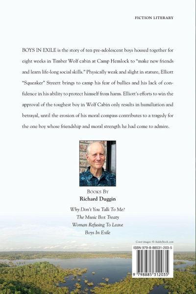 --Grand Prize Winner, BookLife/Publishers Weekly 2022 Fiction Contest BOYS IN EXILE is the story of ten pre-adolescent boys housed together for eight weeks in Timber Wolf cabin at Camp Hemlock to "make new friends and learn life-long social skills." Physically weak and slight in stature, Elliott "Squeaker" Streett brings to camp his fear of bullies and his lack of confidence in his ability to protect himself from harm. Elliott's efforts to win the approval of the toughest boy in Wolf Cabin only results in humiliation and betrayal, until the erosion of his moral compass contributes to a tragedy for the one boy whose friendship and moral strength he had come to admire.