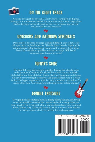 On the Right Track A scandal tore apart the boy band, Vocal Growth, leaving Ru in disgrace. Hiding out in a midwestern suburb, he comes face-to-face with a high school student he hopes can look beyond his past. Can a former pop star find romance with the boy next door? ♥♥♥♥ Unicorns and Rainbow Sprinkles Dane joined a boy band to escape a rough childhood, only to have it all fall apart when the band broke up. When he lapses into the depths of his eating disorder, fellow bandmate, Tommy, sends a friend to help, filling Dane's life with glitter, sprinkles, and unicorn magic. Will Dane's unwanted guest become his savior? ♥♥♥♥ Tommy's Song The band fell apart and everyone turned to Tommy, but when he caves to the pressures of celebrity life, who will save him? Lost in the depths of alcoholism and drug addiction, Tommy finds his friends hurt and distant, his family at war amongst themselves, and himself locked away in a rehab facility. His biggest supporter is a girl he barely remembers, who hides a few secrets of her own. Can Tommy work through his past to find a future? ♥♥♥♥ Double Exposure Tory spends his life snapping pictures, hiding behind the lens, and trying to see the world like everyone else. Autistic and with a strong dislike for being touched, he is surprised when a boy he admires kisses him. Confused by the feelings, Tory is launched into the chance to step out from behind the camera, explore who he is, and find love and acceptance. Note: Stories feature teens in love with boy band stars or other teen celebrities and real life issues. Sweet romance, teen romance, LGBTQIA+ on the spectrum for teen readers. Novels are re-edited and expanded, previously published under the pen name Sam Kadence. See the look inside for possible content triggers.