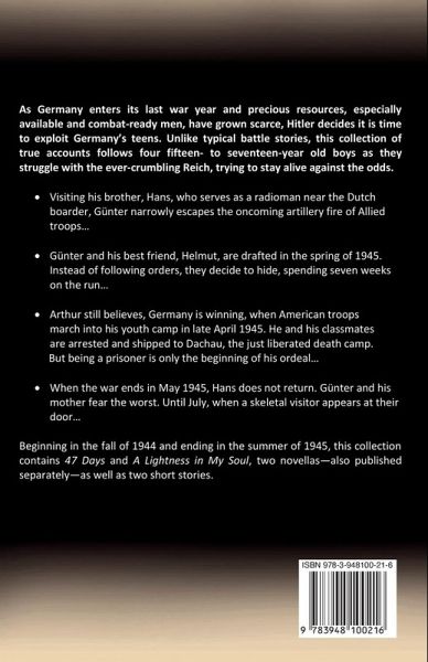 As Germany enters its last war year and precious resources, especially available and combat-ready men, have grown scarce, Hitler decides it is time to exploit Germany's teens. Unlike typical battle stories, this collection of true accounts follows four fifteen- to seventeen-year old boys as they struggle with the ever-crumbling Reich, trying to stay alive against the odds. · Visiting his brother, Hans, who serves as a radioman near the Dutch boarder, Günter narrowly escapes the oncoming artillery fire of Allied troops... · Günter and his best friend, Helmut, are drafted in the spring of 1945. Instead of following orders, they decide to hide, spending seven weeks on the run... · Arthur still believes, Germany is winning, when American troops march into his youth camp in late April 1945. He and his classmates are arrested and shipped to Dachau, the just liberated death camp. But being a prisoner is only the beginning of his ordeal... · When the war ends in May 1945, Hans does not return. Günter and his mother fear the worst. Until July, when a skeletal visitor appears at their door... Beginning in the fall of 1944 and ending in the summer of 1945, this collection contains 47 Days and A Lightness in My Soul, two novellas-also published separately-as well as two short stories.