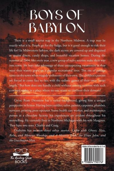 Synopsis: There is a small tourist trap in the Northern Midwest. A trap may be exactly what it is. People go for the fudge, but is it good enough to risk their lives? In Midwestern fashion, the dark secrets are covered up and disguised as quaint diners, candy shops, and beautiful vacation homes. During the summer of 2004, like every year, a new group of naïve tourists make their way into town. Six boys take advantage of these unsuspecting vacationers as they meet their watery grave on a popular recreational river. This rite of passage turns on the town when tragedy strikes one of their own. The children's parents are forced to come face to face with the sadistic games of their once "sweet angels." But how does one handle a child without coming to terms with such a twisted reality in a place where no one wants to confront their demons? Autobiography: Craig Rory Draheim has a varied background, giving him a unique perspective in fiction. Having been a soldier, sailor, painter, carpenter, plumber, surveyor, printing press operator, home health care worker, and maintenance person at a chocolate factory, his experiences are evident throughout his storytelling. He currently lives in Northern Michigan with his wife Margaret. They have two sons, Charles and Craig. Draheim has written three other stories: Coffee with Ghosts; Nuts, Bolts, and Monster Worship; and A History Book, Sir Elton John, and The Grasshopper Man.