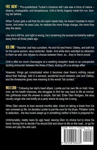 Free Agent Pro-quarterback Tucker's romance with Lela was a force of nature - steamy, unstoppable, and tempestuous. Until a family tragedy made him run, leaving her behind. When Tucker gets a call that his old coach needs help, he doesn't hesitate to return home. And when he sees Lela, he realizes the more things change, the more they stay the same. Like she's still his, and right or wrong, he's reclaiming the woman he foolishly walked away from all those years ago. Red Zone Rancher Joel has a problem. He and his best friend, Oakley, are both hot for the same woman, sexy local bartender, Sadie. And while she's admitted an attraction to them as well, she refuses to choose between them, so...they're friend zoned. Until a little too much champagne at a wedding reception leads to an unexpected sizzling encounter between the three of them, kicking off a no-strings affair. However, things get complicated when it becomes clear there's nothing casual about their feelings. Add in a sensual, accidental touch between Joel and Oakley, and the threesome gives new meaning to the words "full contact." Wild Card Following her dad's heart attack, Lorelie put her own life on hold. However, as his health improves, she struggles to find her way back to life as normal. Her girlfriends insist the answer is simple. Get laid. Enter Glen Rodgers, the sexy country singer she met briefly at a party where he sang her a song. When Glen returns to town several months later, intent on taking a break from his own screwed up life, he decides Lorelie is just the cure for his blues. Flirtation turns to seduction...the two lovers swept up in something neither of them is prepared for. Unfortunately, reality rears its ugly head, leaving Glen no choice but to show his hand, forcing him to decide if he should fold and return to life on the road...or go for broke and play the wild card.