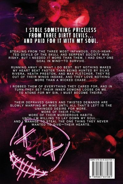 They swore I would fall for their depravity, and I told myself I could resist... I lied. Stealing from the three most infamous, cold-hearted devils of the Skull and Serpent Society was risky, but I needed it more than them. I had only one goal in mind-to survive. Running away is what I do best. But nothing makes my heart beat faster than being hunted by Silas Rivera, Heath Preston, and Max Fletcher. They're out of their minds insane, and they love nothing more than a wicked chase. I robbed them of everything they cared for, and in turn they set their inner demons loose on me. To atone for my…mehr