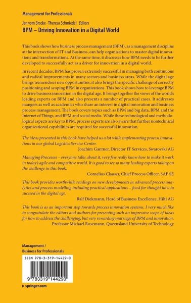 In recent decades, BPM has proven extremely successful in managing both continuous and radical improvements in many sectors and business areas. While the digital age brings tremendous new opportunities, it also brings the specific challenge of correctly positioning and scoping BPM in organizations. This book shows how to leverage BPM to drive business innovation in the digital age. It brings together the views of the world's leading experts on BPM and also presents a number of practical cases. It addresses mangers as well as academics who share an interest in digital innovation and business process management. The book covers topics such as BPM and big data, BPM and the Internet of Things, and BPM and social media. While these technological and methodological aspects are key to BPM, process experts are also aware that further nontechnical organizational capabilities are required for successful innovation.