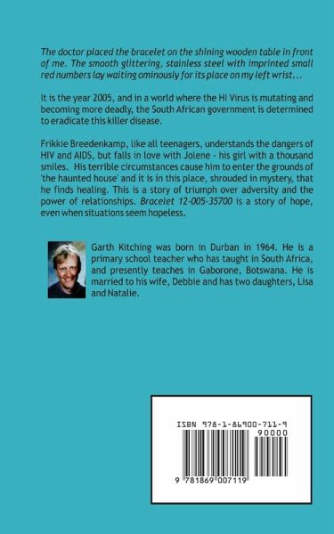Garth Kitching's 'Bracelet 12-007-35700, set in a school situation, with a mutated HIV on the run, every pupil is given a monthly clearance blood test and infected pupils have to wear an identifying bracelet. Frikkie Bredenkamp, the main character, is found to be infected, much to his parents' shock. His thought and fears are explored an teenage boys battling with their sexuality will identify with Frikkie. The issue of viral mutation would not be a familiar one with many young people the story should instigate sober reflection in pupils as they chew on the possibility of mutation. "The doctor placed the bracelet on the shining wooden table in front of me. The smooth glittering stainless steel with imprinted small red numbers lay waiting ominously for its place on my left wrist." It is the year 2007. Frkkie Breedenkamp, like all teenagers, understands the dangers of HIV and AIDS but falls in love with Jolene, 'his girl with a thousand smiles.' His terrible circumstances cause him to enter the grounds of 'the haunted house' and it is in this place, shrouded in mystery, that he finds healing. This is the story of triumph over adversity and the power of relationships. Bracelet 12-007-35700 is the story of hope, even when situations seem hopeless.