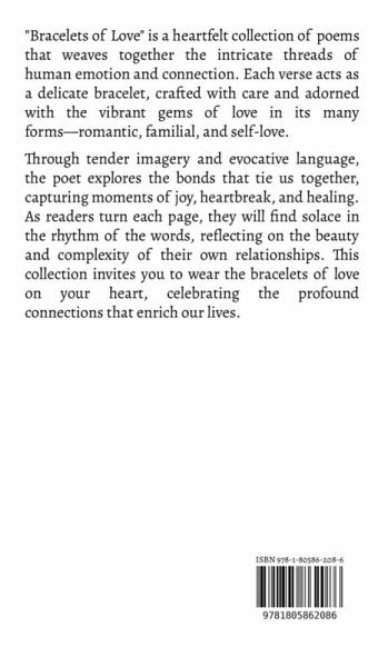 "Bracelets of Love" is a heartfelt collection of poems that weaves together the intricate threads of human emotion and connection. Each verse acts as a delicate bracelet, crafted with care and adorned with the vibrant gems of love in its many forms-romantic, familial, and self-love. Through tender imagery and evocative language, the poet explores the bonds that tie us together, capturing moments of joy, heartbreak, and healing. As readers turn each page, they will find solace in the rhythm of the words, reflecting on the beauty and complexity of their own relationships. This collection invites you to wear the bracelets of love on your heart, celebrating the profound connections that enrich our lives.