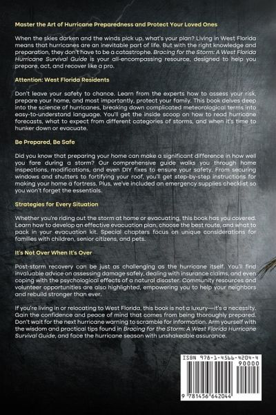 Master the Art of Hurricane Preparedness and Protect Your Loved Ones When the skies darken and the winds pick up, what's your plan? Living in West Florida means that hurricanes are an inevitable part of life. But with the right knowledge and preparation, they don't have to be a catastrophe. Bracing for the Storm: A West Florida Hurricane Survival Guide is your all-encompassing resource, designed to help you prepare, act, and recover like a pro. Attention: West Florida Residents Don't leave your safety to chance. Learn from the experts how to assess your risk, prepare your home, and most importantly, protect your family. This book delves deep into the science of hurricanes, breaking down complicated meteorological terms into easy-to-understand language. You'll get the inside scoop on how to read hurricane forecasts, what to expect from different categories of storms, and when it's time to hunker down or evacuate. Be Prepared, Be Safe Did you know that preparing your home can make a significant difference in how well you fare during a storm? Our comprehensive guide walks you through home inspections, modifications, and even DIY fixes to ensure your safety. From securing windows and shutters to fortifying your roof, you'll get step-by-step instructions for making your home a fortress. Plus, we've included an emergency supplies checklist so you won't forget the essentials. Strategies for Every Situation Whether you're riding out the storm at home or evacuating, this book has you covered. Learn how to develop an effective evacuation plan, choose the best route, and what to pack in your evacuation kit. Special chapters focus on unique considerations for families with children, senior citizens, and pets. It's Not Over When It's Over Post-storm recovery can be just as challenging as the hurricane itself. You'll find invaluable advice on assessing damage safely, dealing with insurance claims, and even coping with the psychological effects of a natural disaster. Community resources and volunteer opportunities are also highlighted, empowering you to help your neighbors and rebuild stronger than ever. If you're living in or relocating to West Florida, this book is not a luxury-it's a necessity. Gain the confidence and peace of mind that comes from being thoroughly prepared. Don't wait for the next hurricane warning to scramble for information. Arm yourself with the wisdom and practical tips found in Bracing for the Storm: A West Florida Hurricane Survival Guide, and face the hurricane season with unshakeable assurance.