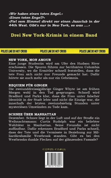 Drei New York-Krimis in einem BandNEW YORK, MON AMOUREine junge Studentin wird am Ufer des Hudson River erschossen. Die Spuren führen zur berühmten Columbia University, wo die Ermittler schnell feststellen, dass die tote Frau sich nicht nur Freunde gemacht hat. Dafür hütete sie auch mehr als nur ein Geheimnis.REQUIEM FÜR GINGERDie zweiunddreissigjährige Ginger Whyte ist am frühen Morgen wohl in den Tod gesprungen. Schnell wird Bradford und Parks klar, dass die Frau unter falscher Identität in der Stadt lebte und nicht die Einzige war, die innerhalb der letzten zweiundsiebzig Stunden unter mysteriösen Umständen zu Tode kam.SCHNEE ÜBER MANHATTANDezember. Schnee liegt in der Luft und auf der Strasse ein Weihnachtsmann: Curtis Rudolph war ein beliebter Wohltäter in Manhattan. Seine Freundin ist nicht auffindbar. Dafür erkennen Bradford und Parks schnell, dass der Tote und die Vermisste in Beziehung zur Milliardärsfamilie Westbrook standen. Gibt es bei den Westbrooks dunkle Flecken auf der glänzenden Fassade?