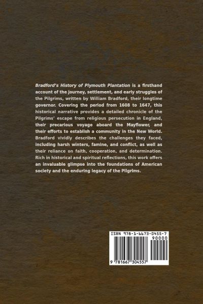 Bradford's History of Plymouth Plantation is a firsthand account of the journey, settlement, and early struggles of the Pilgrims, written by William Bradford, their longtime governor. Covering the period from 1608 to 1647, this historical narrative provides a detailed chronicle of the Pilgrims' escape from religious persecution in England, their precarious voyage aboard the Mayflower, and their efforts to establish a community in the New World. Bradford vividly describes the challenges they faced, including harsh winters, famine, and conflict, as well as their reliance on faith, cooperation, and determination. Rich in historical and spiritual reflections, this work offers an invaluable glimpse into the foundations of American society and the enduring legacy of the Pilgrims.