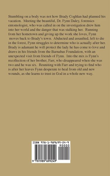 Stumbling on a body was not how Brady Coghlan had planned his vacation. Meeting the beautiful, Dr. Fynn Daley, forensics entomologist, who was called in on the investigation drew him into her world and the danger that was stalking her. Running from her hometown and giving up the work she loves, Fynn moves back to Brady's town. Abducted and assaulted, left to die in the forest, Fynn struggles to determine who is actually after her. Brady is adamant he will protect the lady he has come to love and draws in his friends from the Barnabas Foundation, with an unexpected visit from friends of Fynn. Into the mix is Fynn's recollection of her brother, Farr, who disappeared when she was two and he was six. Reuniting with Farr and trying to find who is after her leaves Fynn desperate to heal from old and new wounds, as she learns to trust in God in a whole new way.