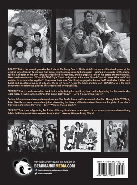 BRADYPEDIA is the newest, grooviest book about The Brady Bunch. The book tells the story of the development of the original series through its end and then delves into the many spin-offs that ensued. There’s a price guide for the memorabilia, a chapter on the 80+ songs recorded by the Brady kids, and biographical info on the actors and their families. New revelations abound. What did Chief Eagle Cloud really say to Alice in the Grand Canyon? Were Mike and Carol scripted to have a baby together? How many times was Peter Brady engaged to be married? And what if Mike and Carol had adopted a bunch of kids after theirs left home? Open the book and find out! BRADYPEDIA is the most comprehensive reference guide to The Brady Bunch ever published. "BRADYPEDIA is a well-researched book that is enlightening for any Brady fan...and enlightening for the people who were there. I found out some things that even I didn't know." --Lloyd J. Schwartz (producer) "A fun, informative and comprehensive look into The Brady Bunch and its extended afterlife. Through BRADYPEDIA, Erika Woehlk has done an excellent job of chronicling the history of the characters, the actors, the plots: from where they came and where they are." --Barry Williams ("Greg Brady") "BRADYPEDIA is an enlightening book that all Brady Bunch fans should read. It has many obscure and astonishing tidbits that have never been exposed before now." --Wendy Winans (Brady World)