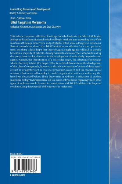 This volume contains a collection of writings from the leaders in the fields of Molecular Biology and Melanoma Research which will begin to tell the ever-expanding story of the most recent findings, discoveries, and potential of BRAF-directed targets in melanoma. Recent research has shown that BRAF inhibitors are effective for a short period of time, but there is little hope that this drugs as single agents will lead to durable benefit in a majority of patients. Among scientists and researchers who work in drug discovery, there is a lot of interest in the development of molecularly targeted cancer agents. Namely, the identification of a molecular target, the selection of molecules which effectively inhibit this target. What is starkly different about the development of this class of compounds, however, is that the mechanism of action of these agents are not as straightforward as was once previously assumed and the mechanisms of resistance that tumor cells employ to evade completedestruction are unlike any that have been described before. These discoveries in addition to utilization of modern molecular biology techniques have led to a series of hypotheses regarding which other types of molecules could be used in combination with BRAF-inhibitors in hopes of revolutionizing the potential of therapeutics in melanoma.