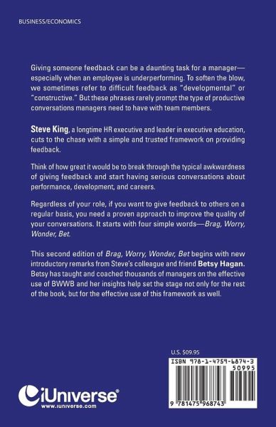 Giving someone feedback can be a daunting task for a manager- especially when an employee is underperforming. To soften the blow, we sometimes refer to diffi cult feedback as "developmental" or "constructive." But these phrases rarely prompt the type of productive conversations managers need to have with team members. Steve King, a longtime HR executive and leader in executive education, cuts to the chase with a simple and trusted framework on providing feedback. Think of how great it would be to break through the typical awkwardness of giving feedback and start having serious conversations about performance, development, and careers. Regardless of your role, if you want to give feedback to others on a regular basis, you need a proven approach to improve the quality of your conversations. It starts with four simple words-Brag, Worry, Wonder, Bet. This second edition of Brag, Worry, Wonder, Bet begins with new introductory remarks from Steve's colleague and friend Betsy Hagan. Betsy has taught and coached thousands of managers on the effective use of BWWB and her insights help set the stage not only for the rest of the book, but for the effective use of this framework as well.