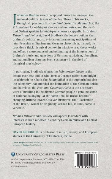Offers a historical context in which to understand how Brahms's three most intensely political and nationalistic works interact with questions of German patriotism, liberalism and nationalism. Johannes Brahms rarely composed music that engaged the national-political issues of the day. Three of his works, though, do precisely this: the Fünf Lieder für Männerchor; the Triumphlied for eight-part chorus and orchestra; and the Fest- und Gedenksprüche for eight-part chorus a cappella. In Brahms Patriotic and Political, David Brodbeck challenges notions that Brahms's political music evinces embarrassing anticipations of later Prussian militarism and German chauvinism. Instead, he provides a thick historical context in which to read these works and offers a more nuanced understanding of the intersections of Brahms's music and questions of German patriotism, liberalism, and nationalism than has been customary in the field of historical musicology. In particular, Brodbeck relates the Männerchor-Lieder to the debate over how and in what form a German nation-state might be achieved; he relates the Triumphlied to the euphoria but also the solemnity that attended the foundation of the German Reich; and he relates the Fest- und Gedenksprüche to the necessary work of instilling in the diverse German people a genuine sense of national belonging. At the same time, he traces Brahms's changing attitude toward Otto von Bismarck, the "Blacksmith of the Reich," whom he originally loathed but, in time, came to venerate. Brahms Patriotic and Political will appeal to readers with interests in both nineteenth-century German music and Central European history.