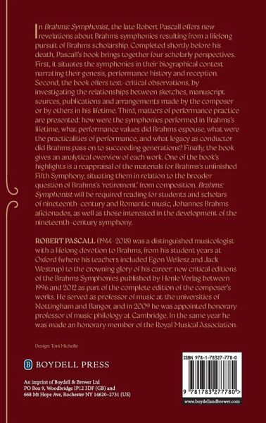 This long-awaited book situates the symphonies in their biographical context, offers text-critical investigations, presents matters of performance practice and gives an analytical overview of each work. In Brahms: Symphonist, the late Robert Pascall offers new revelations about Brahms symphonies resulting from a life-long pursuit of Brahms scholarship. Completed shortly before his death, Pascall's book brings together four scholarly perspectives. First, it situates the symphonies in their biographical context narrating their genesis, performance history and reception. Second, the book offers text-critical observations, by investigating the relationships between sketches, manuscript sources, publications and arrangements made by the composer or by others in his lifetime. Third, matters of performance practice are presented: how were the symphonies performed in Brahms's lifetime, what performance values did Brahms espouse, what were the practicalities of performance, and what legacy as conductor did Brahms pass on to succeeding generations? Finally, the book gives an analytical overview of each work. One of the book's highlights is a reappraisal of the materials for Brahms's unfinished Fifth Symphony, situating them in relation to the broader question of Brahms's 'retirement' from composition. Brahms: Symphonist will be required reading for students and scholars of nineteenth-century and Romantic music, Johannes Brahms aficionados, as well as those interested in the development of the nineteenth-century symphony.