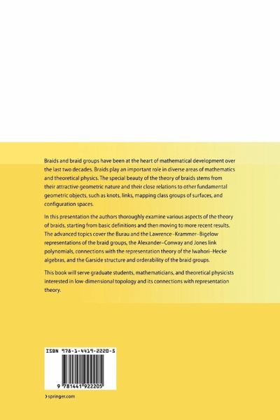 In this well-written presentation, motivated by numerous examples and problems, the authors introduce the basic theory of braid groups, highlighting several definitions that show their equivalence; this is followed by a treatment of the relationship between braids, knots and links. Important results then treat the linearity and orderability of the subject. Relevant additional material is included in five large appendices.