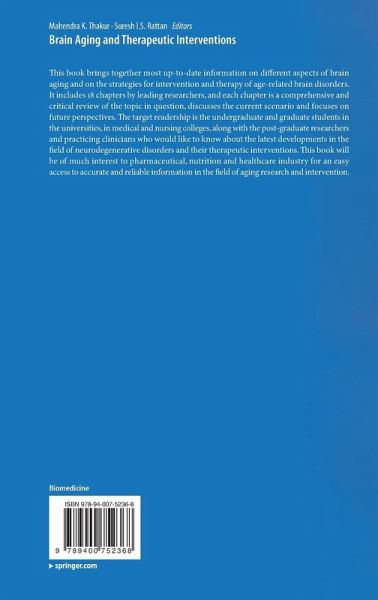 This book brings together most up-to-date information on different aspects of brain aging and on the strategies for intervention and therapy of age-related brain disorders. It includes 18 chapters by leading researchers, and each chapter is a comprehensive and critical review of the topic in question, discusses the current scenario and focuses on future perspectives. The target readership is the undergraduate and graduate students in the universities, in medical and nursing colleges, along with the post-graduate researchers and practicing clinicians who would like to know about the latest developments in the field of neurodegenerative disorders and their therapeutic interventions. This book will be of much interest to pharmaceutical, nutrition and healthcare industry for an easy access to accurate and reliable information in the field of aging research and intervention.