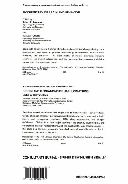This volume contains the proceedings of the fourth international symposium held in November 1970 at the Texas Research Institute of Mental Sciences in Houston. Leading psychiatrists, biochemists, and pharmacologists from the United States and Great Britain presented new material and reviewed current concepts concerning schizophrenia and the affective disorders, with particular reference to the neurochemical basis of the etiology and chemotherapy of these diseases. Although the multiple mechanisms of mental disease are still not fully understood, substantial progress has definitely been made. The greatest contribution has come through the development of new therapeutic agents that not only provide invaluable help to the mentally ill but serve as chemical tools for studying the biological mechanisms associated with the disease state. Studies concerning the proposed catecholamine and indolealkylamine hypotheses for affective disorders and the possible formation of endogenous. toxinsin schizophrenia have stimulated significant new research. This book presents new studies of schizophrenia and the affective disorders in one volume. It is our hope that it represents an effective integration of basic biochemical and pharmacological research with current clinical findings and that it will increase understanding of the etiology of mental disease and provide an impetus for the development of more effective therapeutic agents. We thank Drs. Gordon Farrell, Samuel Gershon, A. Horita, Irwin Kopin, and Joseph Schildkraut for their help with the organization of the meeting and for chairing the corresponding sessions.